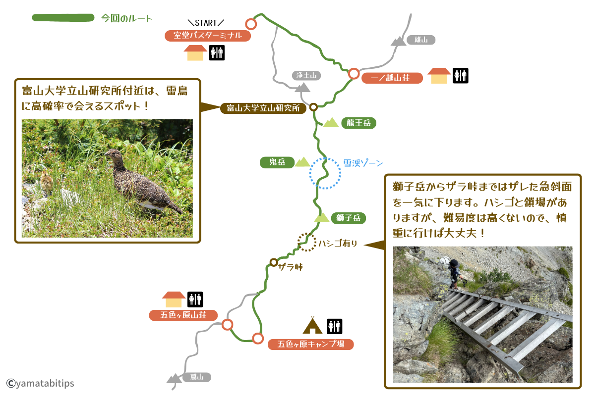今回は、登山道やテント場の様子なども含め、五色ヶ原の登山に必要な情報を分かりやすくご紹介しますね。雷鳥に高確率で会えるスポットもあるので、ぜひチェックしてみてください。